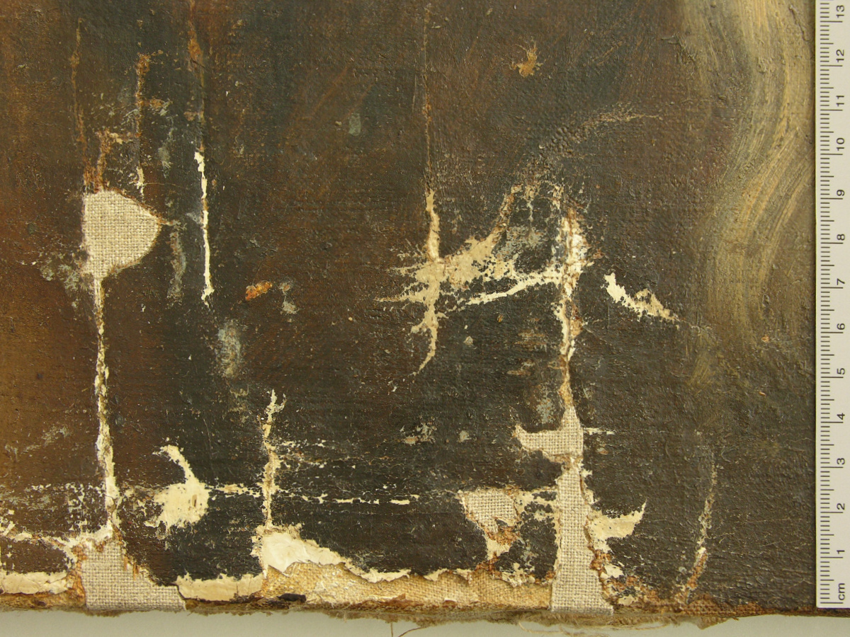 Der Firnis war stark vergilbt und ungleichmäßig. Frühere Retuschen befanden sich vor allem am unteren Rand und im Himmel.